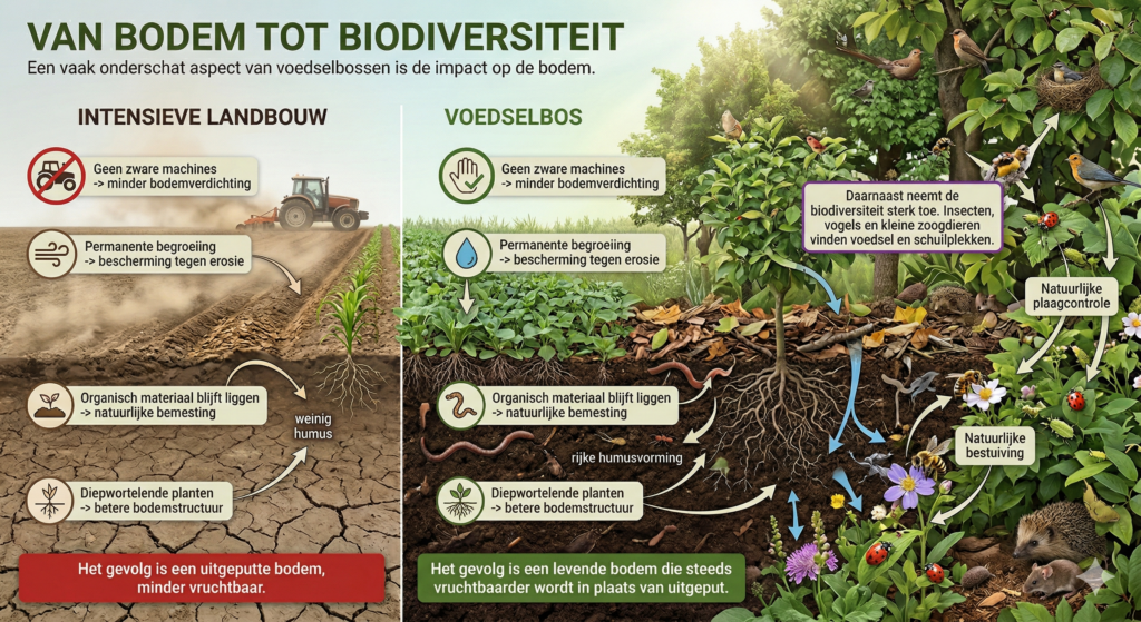 Een vaak onderschat aspect van voedselbossen is de impact op de bodem. Waar intensieve landbouw de bodem vaak uitput, doen voedselbossen het tegenovergestelde.