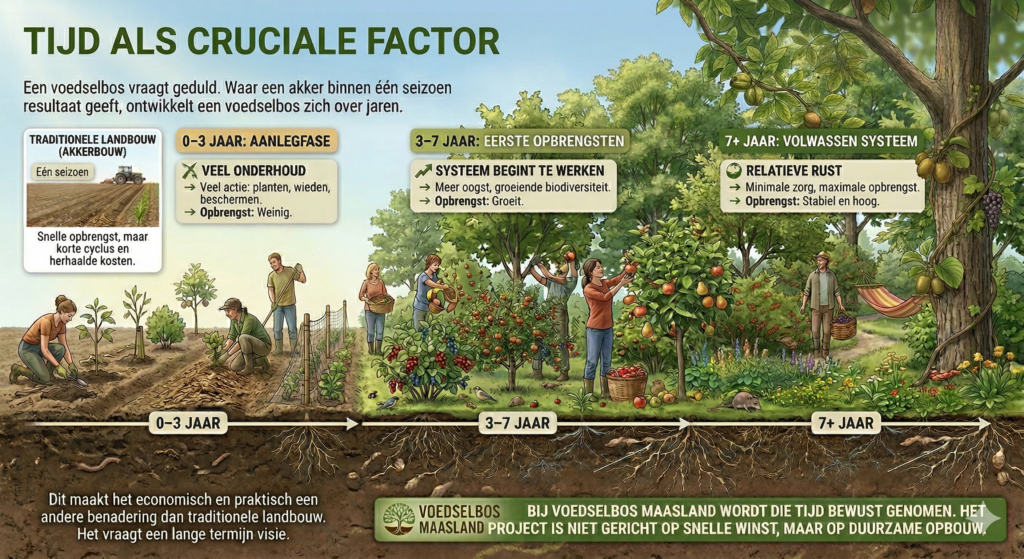 Bij Voedselbos Maasland wordt die tijd bewust genomen. Het project is niet gericht op snelle winst, maar op duurzame opbouw.