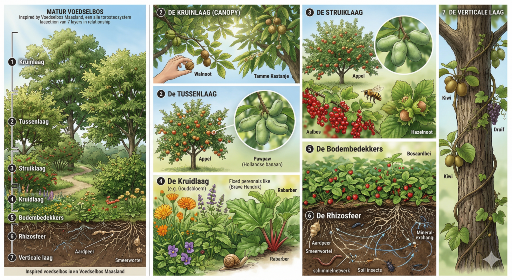 Door deze lagen slim te combineren, creëren we een enorme biomassa op een relatief klein oppervlak. Bij Voedselbos Maasland kun je met eigen ogen zien hoe deze lagen in de praktijk samensmelten.
